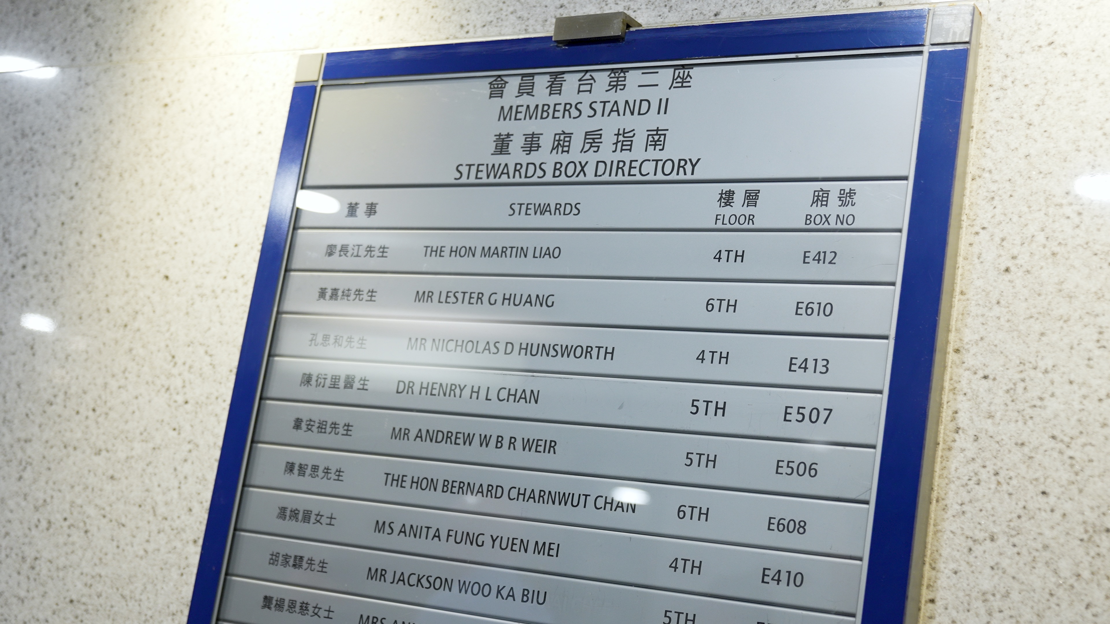 「普通的馬迷通常在公眾席,以$10便可入場,且很熱鬧,較有比賽氣氛;樓上,有大屏幕的影視廳和可以透過玻璃牆壁觀賽的餐廳;再上多幾層,就是更具神秘色彩的廂房。」這些廂房分別屬於馬主、特定公司機構、遴選會員,以及董事。