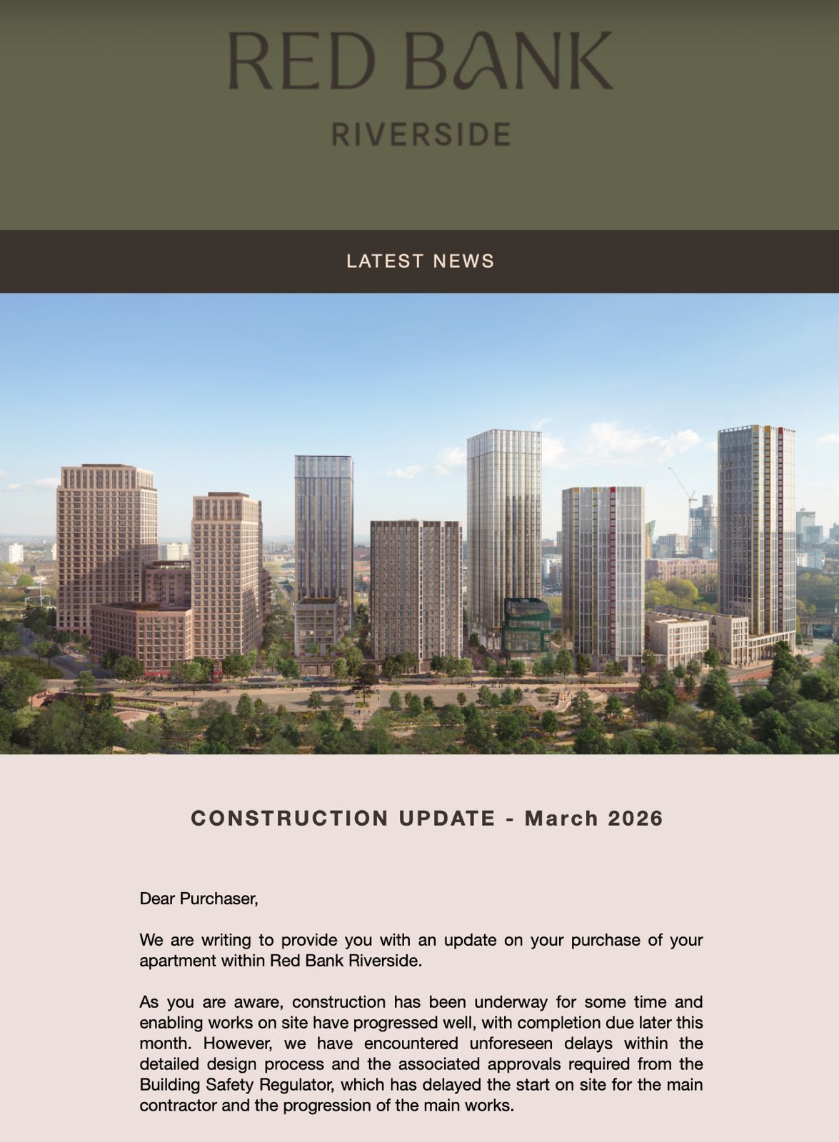 同月,另一曼城項目Red Bank Riverside亦發出最新建築進度更新,確認工程需延長時間。該項目由香港上市公司遠東發展(Far East Consortium)參與發展,總規模約1,550伙。
